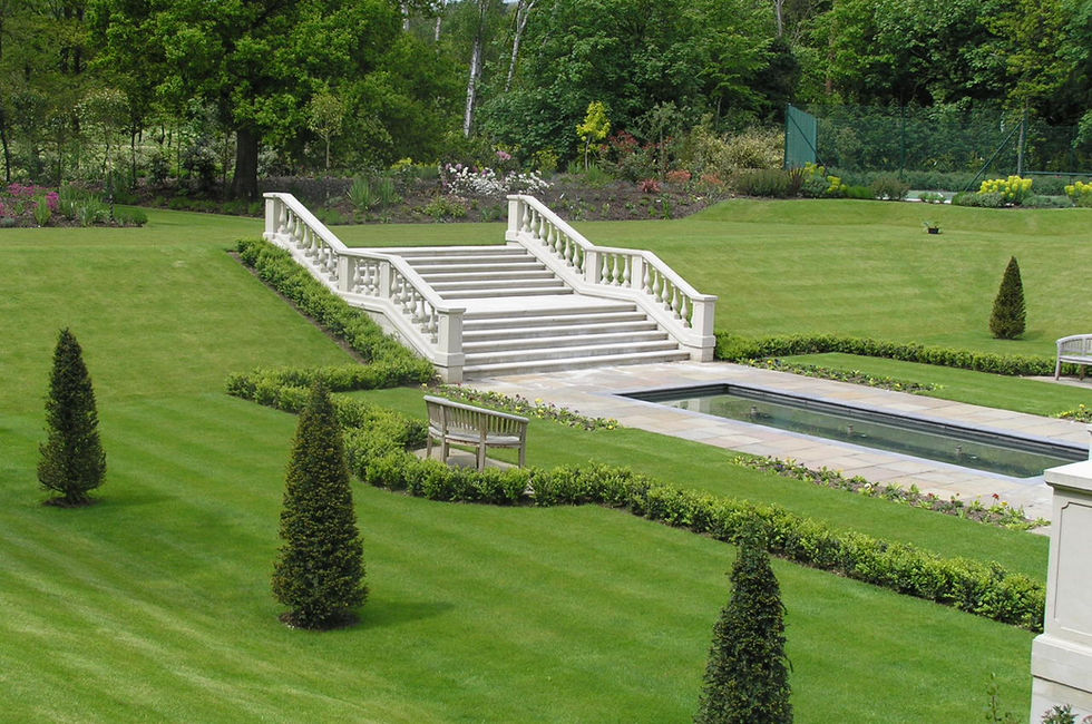 Extensive landscaping around the site, paving, planting and landscape features.